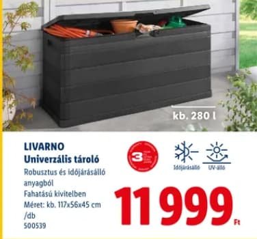 Ez a LIVARNO univerzális tároló első ránézésre is az a fajta darab, amit nem kell túlgondolni. Nem dizájnőrület, nem luxus, viszont pont azt tudja, amire szükség van. El lehet benne pakolni a kerti szerszámokat, slagot, virágföldet, de akár az erkélyen a párnákat vagy kisebb kiegészítőket is.